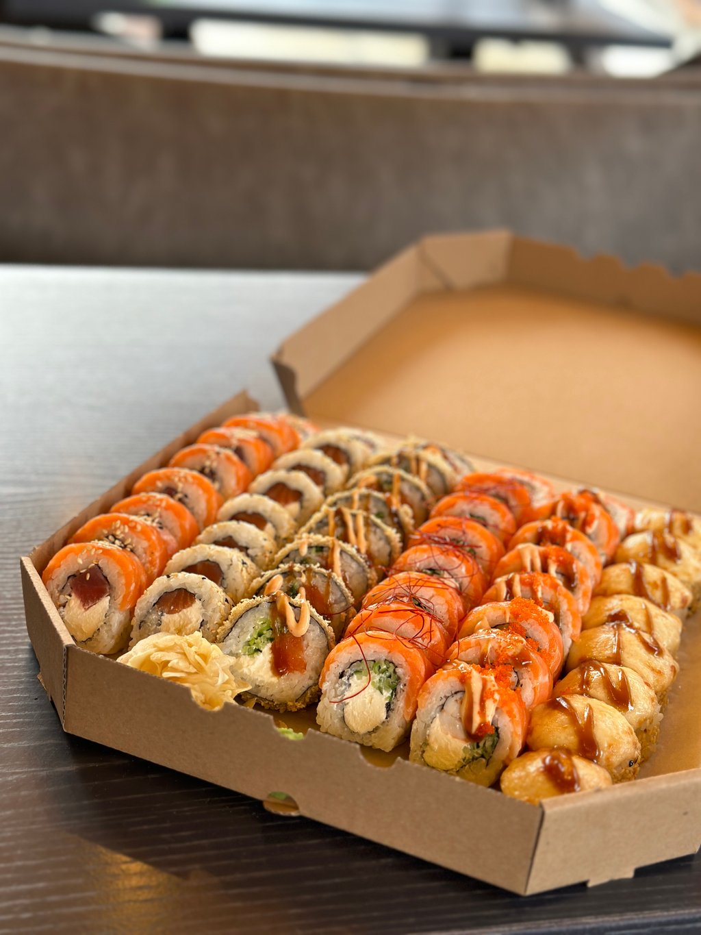 Склад: Рол Ойсі, Дабл фіш, Філадельфія з лососем, Каліфорнія в кунжуті з лососем (без огірка), Темпура з лососем, Гриль чіз з лососем.